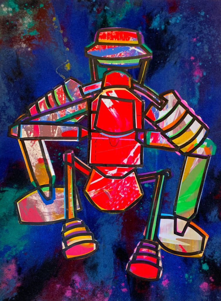 Moving from painting to sculpture, from etchings and aquatints to experimental engraving techniques, from drawing to electronic printing, Volpini—like an architect—assembled polymaterial collages on these supports, generating science-fiction silhouettes in vivid colors that combine the mechanomorphic aspect of spacecraft with the sensitive intelligence of living beings. Thus emerged surreal and dreamlike figurations in which the mechanical element and its spatial devices come to life to the point of personification, incorporating the subjectivity of the collective imagination and the objectivity of the machine.